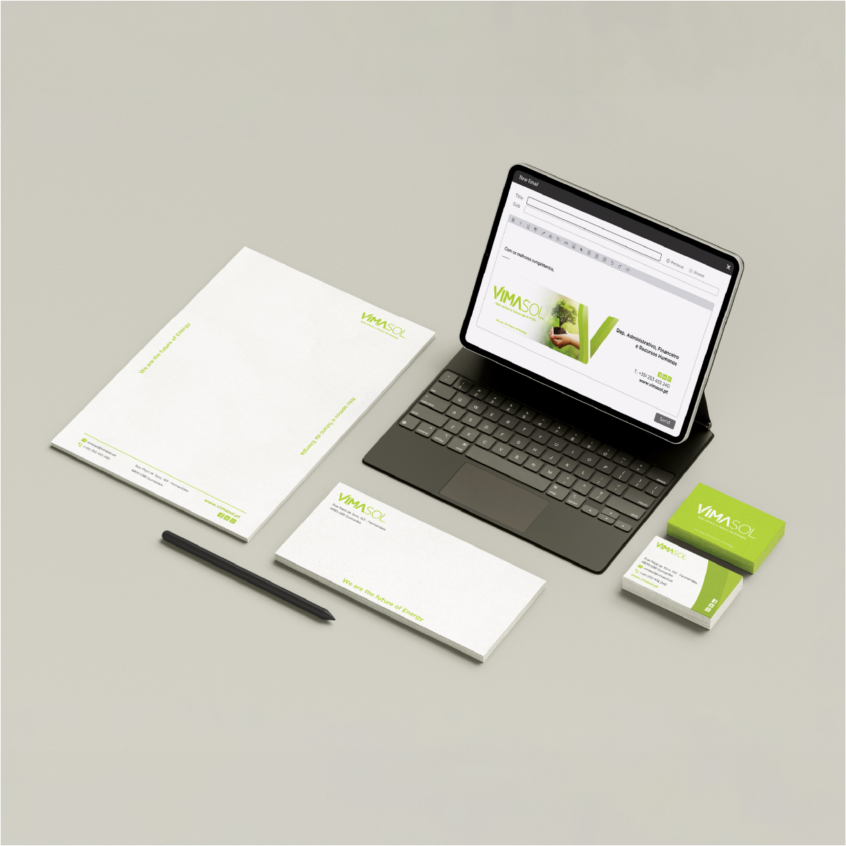 Logótipo e Afirmação: desenvolvemos um novo logótipo que representa de forma atual e única os valores e a missão da Vimasol, acompanhado de uma afirmação que traduz a essência da marca e sua imagem focada na sustentabilidade.